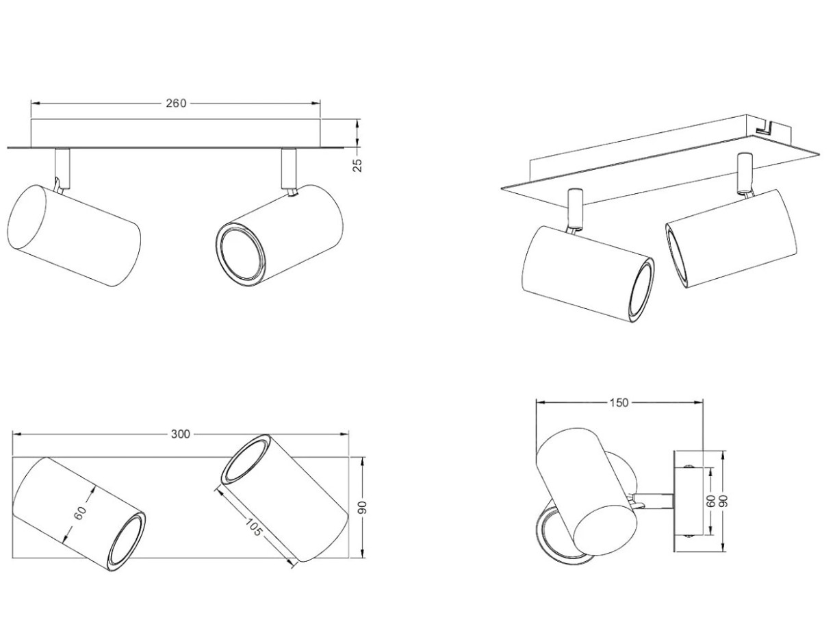 Cele două capete reglabile permit direcționarea luminii în diferite zone, fiind ideal atât pentru iluminat general, cât și pentru iluminat de accent. Designul compact îl face potrivit pentru montaj pe tavan sau perete.