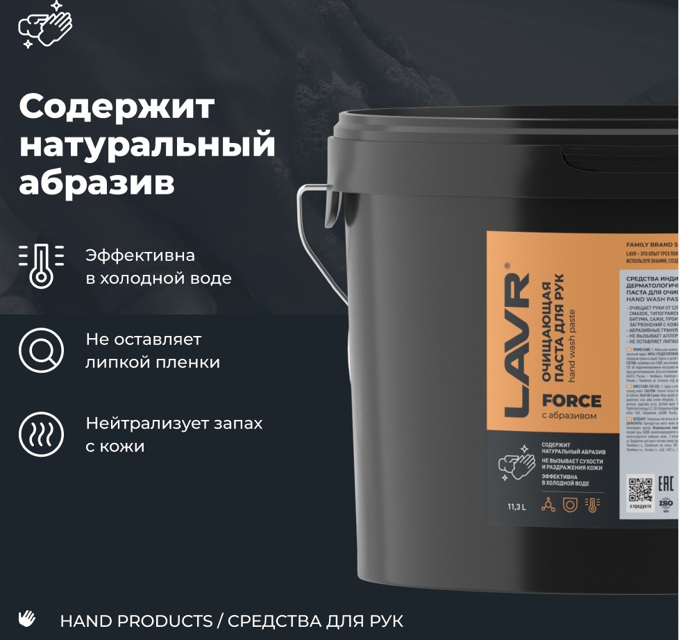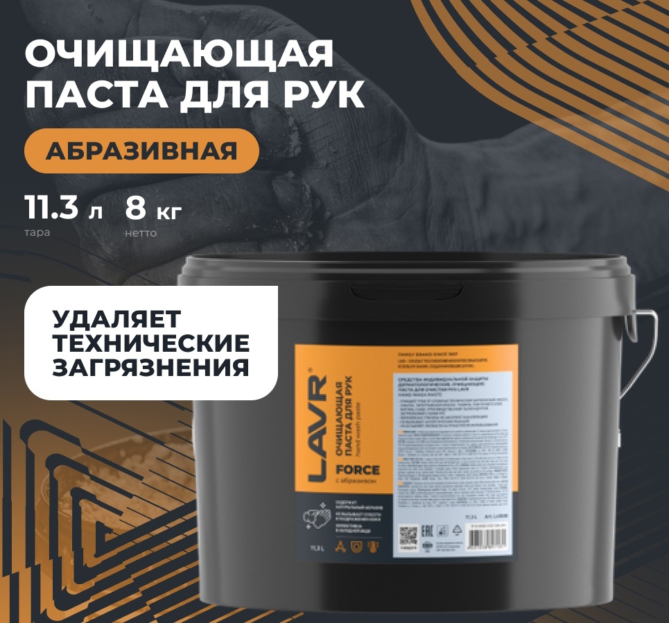 Pastă pentru curățarea mâinilor LAVR SERVICE 11,3 l — produs profesional pentru îndepărtarea murdăriei dificile: ulei, lubrifianți, gudron, funingine și vopsea. Cu component natural abraziv, se clătește ușor cu apă și nu lasă peliculă lipicioasă. Perfect pentru ateliere auto, service-uri și fabrici. Sigură pentru pielea mâinilor dacă este utilizată corect.