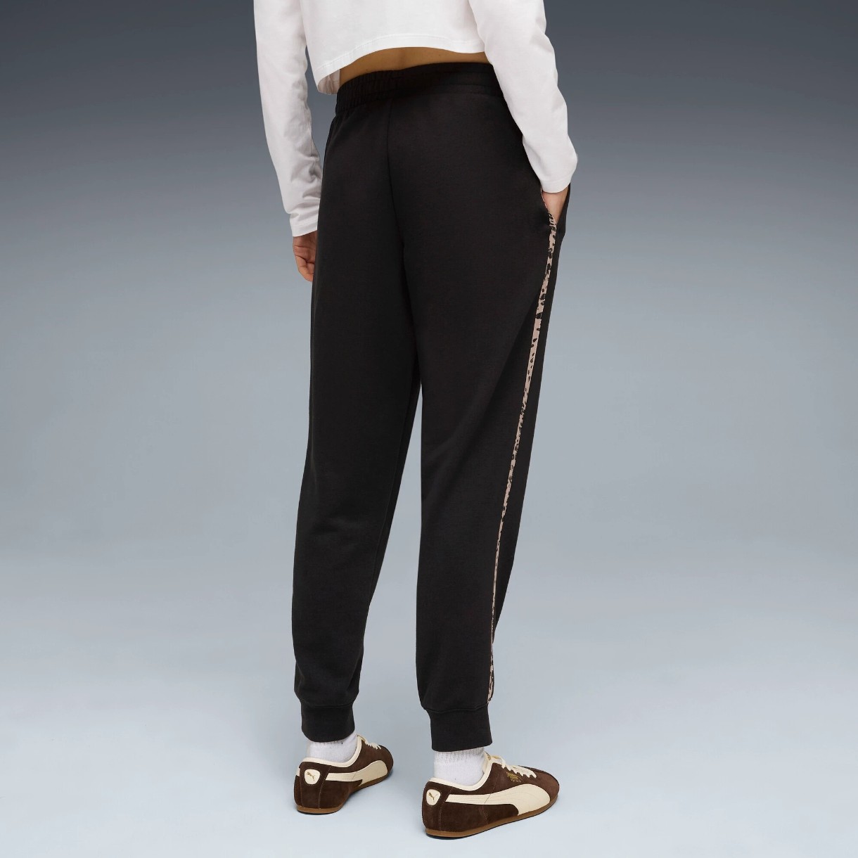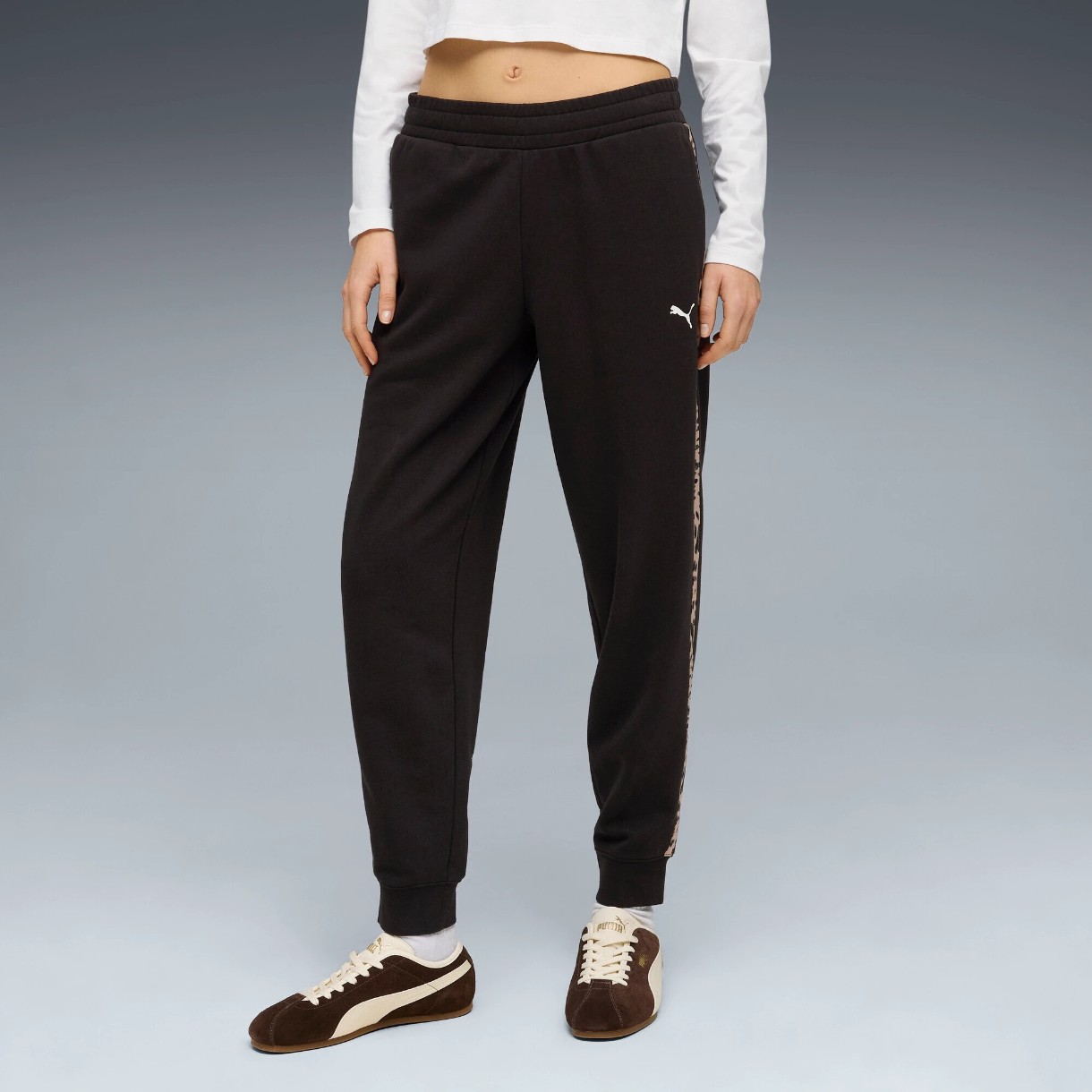 Accentul principal îl reprezintă dungile cu imprimeu leopard pe laterale. Acestea adaugă dinamism, evidențiază liniile siluetei și fac ținuta cu adevărat expresivă. Logo-ul PUMA Cat pe coapsa stângă completează stilul distinctiv.