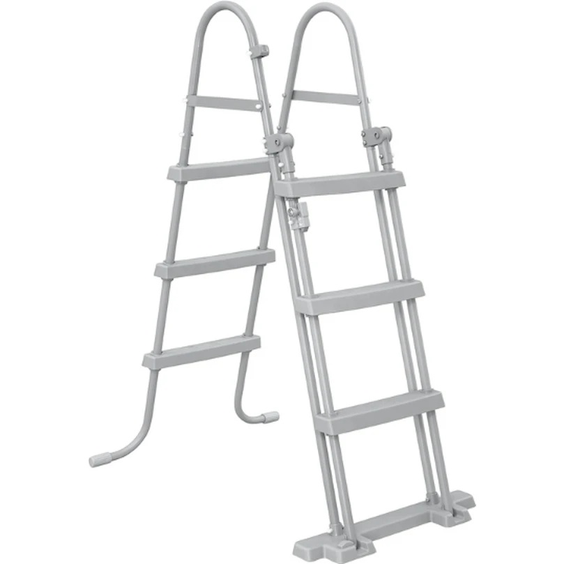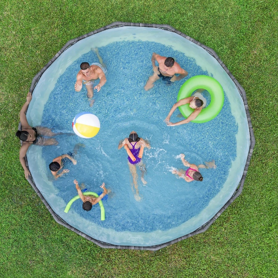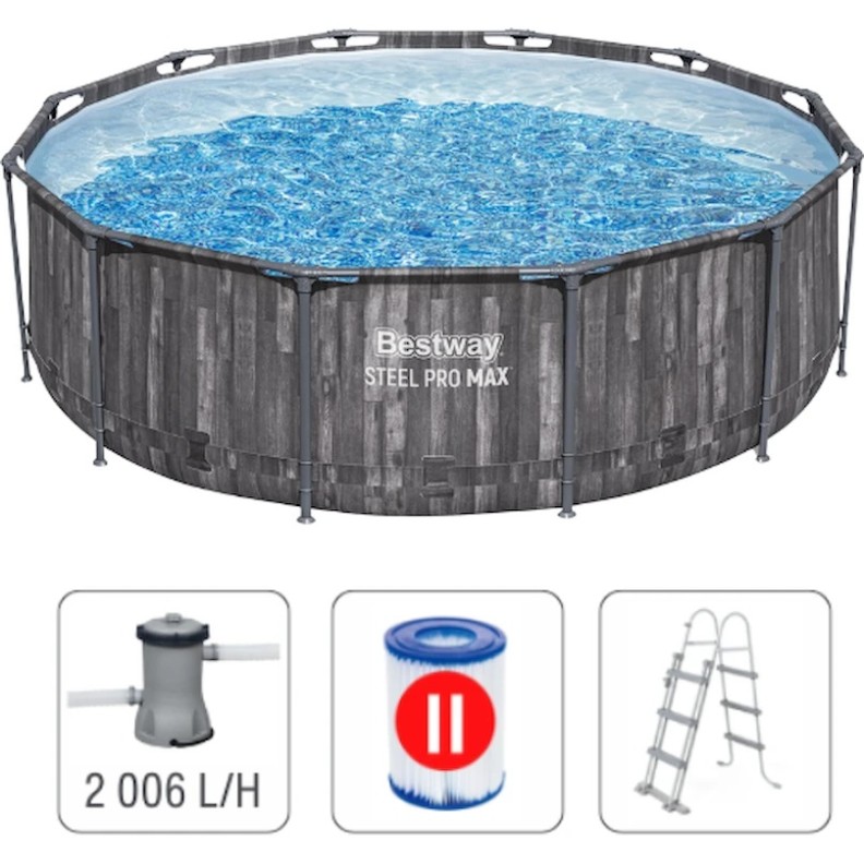 Menținerea formei piscinei este asigurată de o bandă PVC în trei straturi care înconjoară întreaga piscină. În pachet sunt incluse un filtru-pompă cu cartuș, cu capacitatea de 2006 litri pe oră, și o scară.