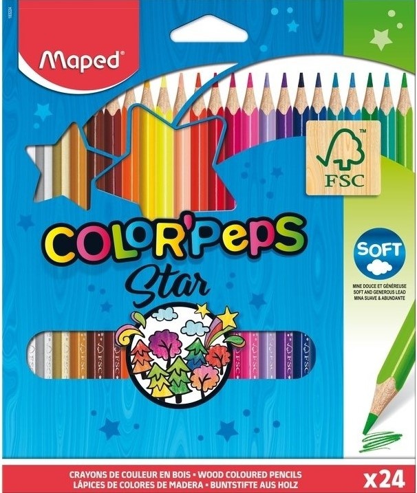 Set 24 creioane colorate, triunghiulare, în cutie de carton.