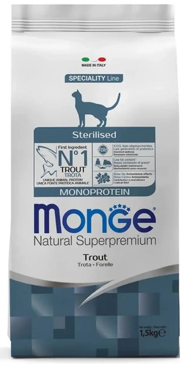 Hrană uscată pentru pisici Monge Superpremium Adult Sterilised Trout 1.5kg