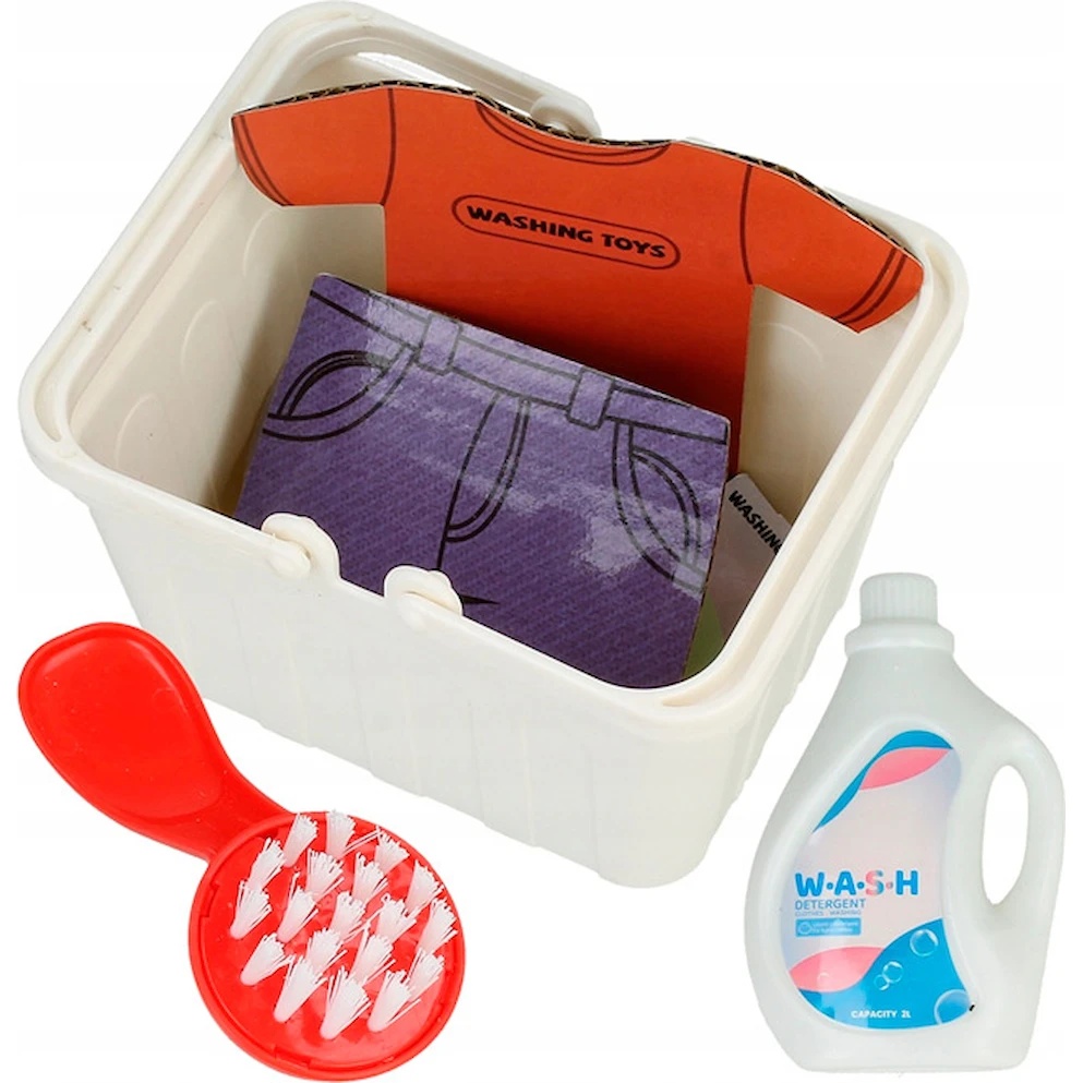 Conținutul setului: setul include 11 accesorii, inclusiv coșuri pentru rufe, haine de jucărie și o sticluță cu detergent.