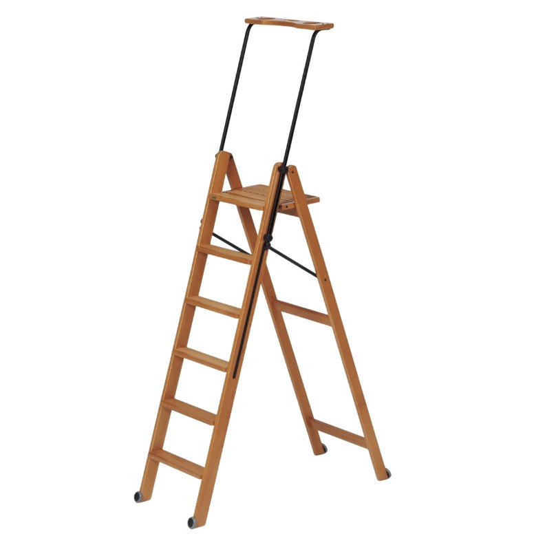 Scara- scaun Arredamenti Tuscania 6 Cherry Tree cu 6 trepte antiderapante este realizată integral din fag masiv, vopsit în culoarea cireșului, și dispune de un sistem de siguranță care previne închiderea accidentală a scării atunci când este deschisă. Construcția robustă și inovativă suportă până la 120 kg. Platforma superioară se află la înălțimea de 132 cm și include o suprafață de sprijin pentru unelte. Scara se închide ușor prin mecanism lateral glisant și, în stare pliată, ocupă doar 12 cm, fiind auto-susținută. Pentru transport facil, sunt prevăzute 4 roți din cauciuc, care funcționează doar în poziție închisă. Treptele din fag au suprafață antiderapantă, produsul a fost testat de TÜV Rheinland Italy și este livrat asamblat, roțile necesită fixare. Original Made in Italy, realizat exclusiv de ARREDAMENTI ITALIA GROUP S.R.L., combină durabilitatea, siguranța și designul funcțional.