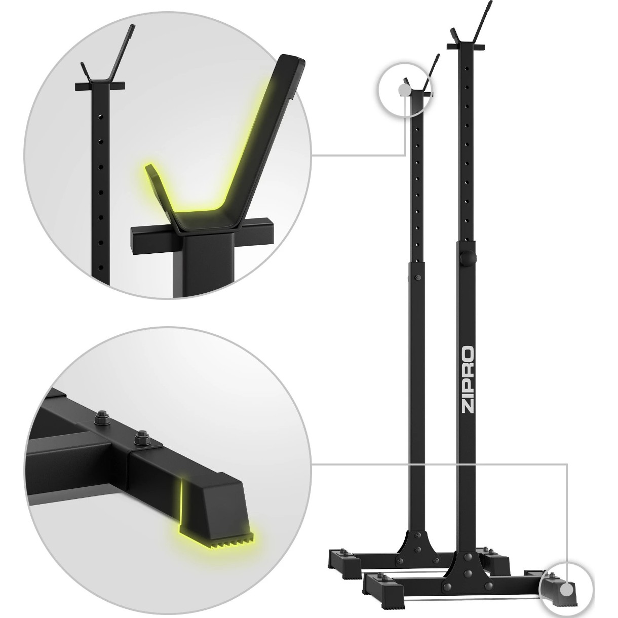 Construcția este pregătită pentru sarcini mari. Suporturile permit antrenamente sigure cu greutăți de până la 350 kg, oferind sprijin stabil pentru așezarea barei.
