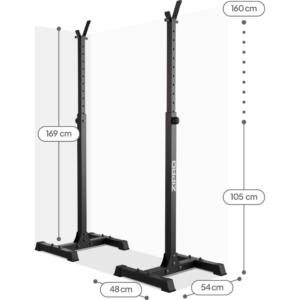 PUSH este un set de suporturi reglabile pentru bară, care oferă stabilitate în timpul antrenamentelor de forță acasă. Reglarea înălțimii între 105–169 cm permite adaptarea pentru diverse exerciții — de la împins la piept până la genuflexiuni. Construcția solidă din profile de oțel 50×50 mm și baza de 48×54 cm asigură rigiditate și durabilitate.