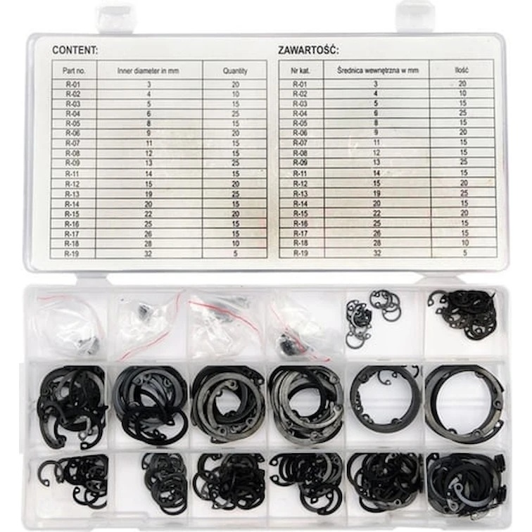 YATO interioare, 300 buc YT-06881 sunt destinate fixării pieselor pe axuri în diverse domenii de activitate. Setul include 300 de stopuri din oțel de înaltă rezistență. Kitul este indispensabil în atelierul auto. Cazul este realizat din plastic de calitate și este echipat cu compartimente convenabile pentru o depozitare rațională.