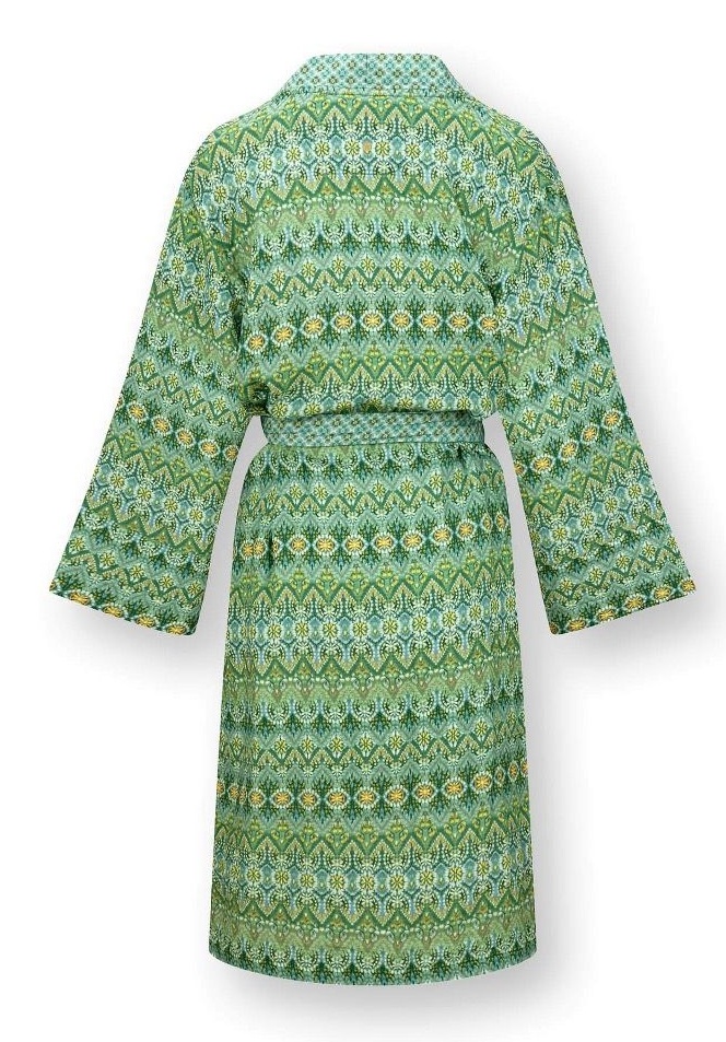Kimonoul Naomi este combinația perfectă de confort și lux. Acest kimono cu mâneci lungi și largi este confecționat din muselină minunat de moale, pentru confort maxim. Designul Ashanti prezintă dungi orizontale în zig-zag cu flori, fluturi și frunze. Dungile colorate curg perfect una în cealaltă.
