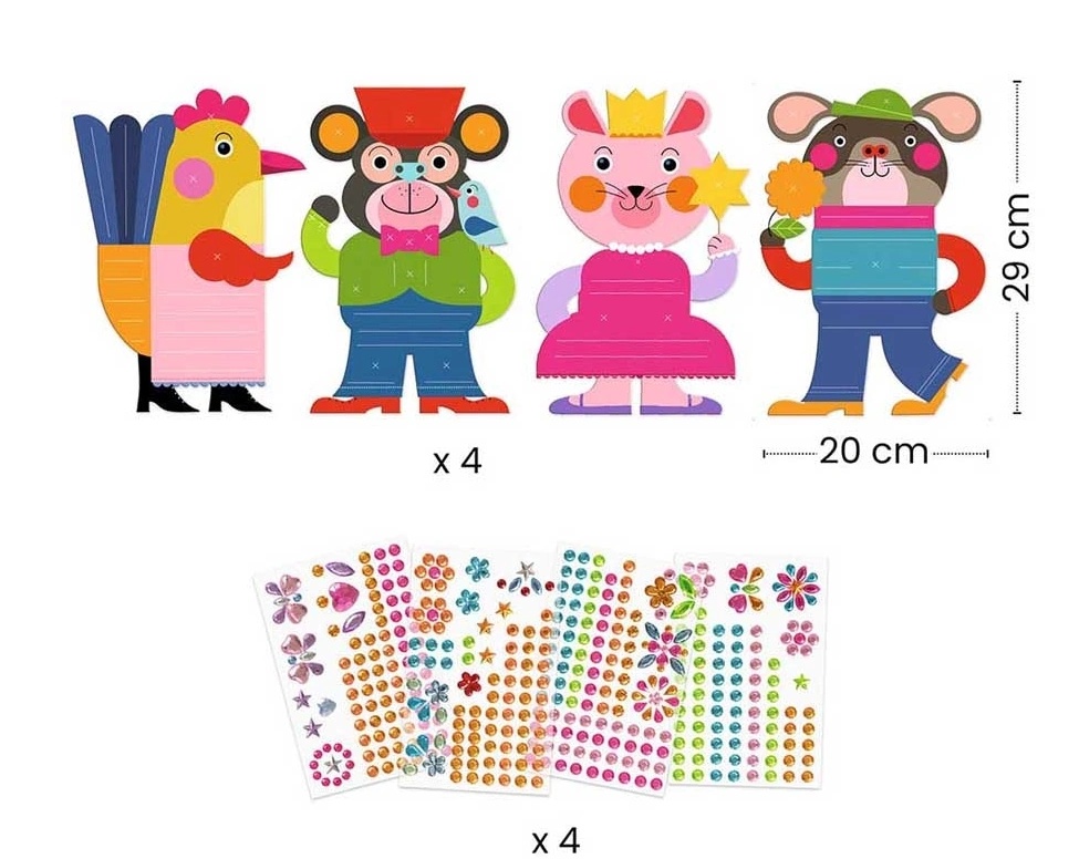 In set4 cartonașe cu animale (20 x 29 cm), 4 pagini de plăci autoadezive, instrucțiuni ilustrate