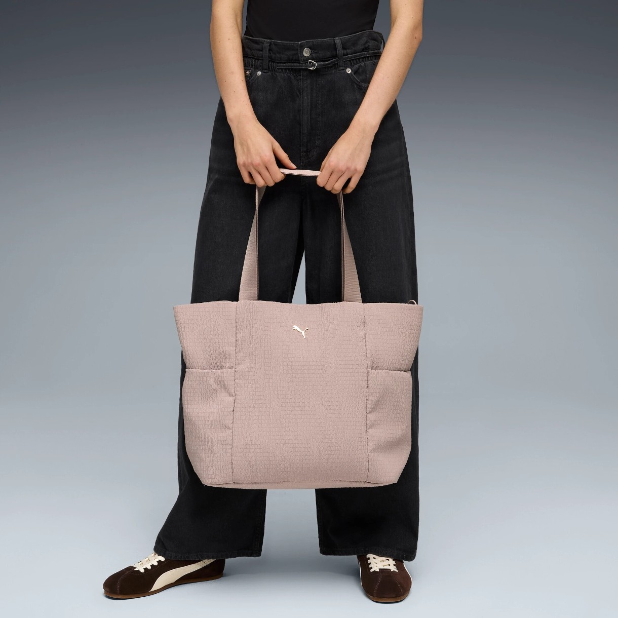 Mânerele rezistente din panglică se așază confortabil în mână, iar logo-ul metalic PUMA Cat adaugă un accent elegant de brand. Materialele sunt plăcute la atingere și rezistente la utilizarea zilnică — cel puțin 90% din geantă este fabricată din materiale reciclate.