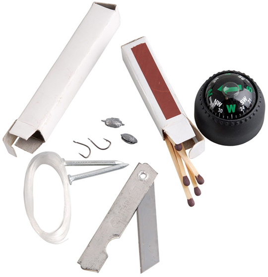 Echipamentfierăstrău, topor, ciocan, cheie, deschizător, unealtă pentru chei de cort, busolă, cuțit, linie de pescuit și cârlig de pește, chibrituri.