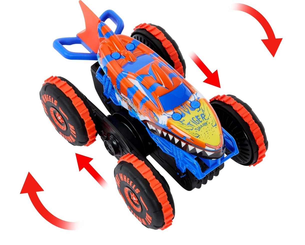 - Funcția Frenzy: butonul de pe telecomandă declanșează o serie de rotații, creând un efect de haos și arătând viteza și stilul Tiger Shark.