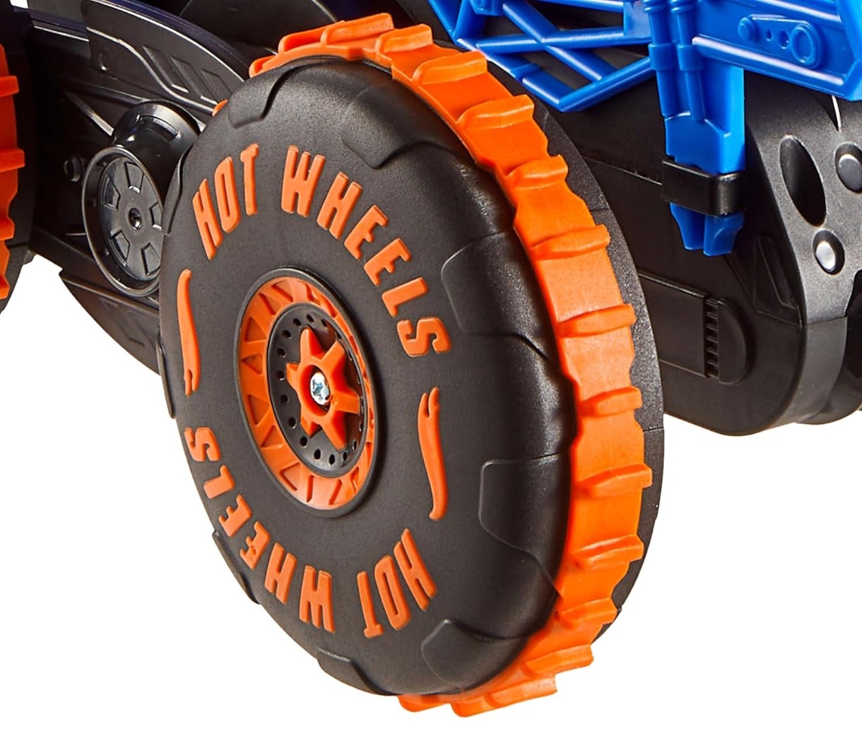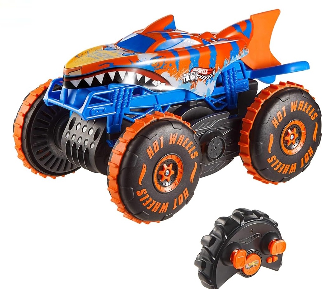 Mașina off-road cu telecomandă Hot Wheels Monster Trucks „Rechin-tigru”, la scară 1:15, este gata pentru distrugere, coliziuni și depășirea oricăror obstacole! Această jucărie are roți multifuncționale Grip Action, care oferă aderență excelentă pe orice suprafață, iar coada extensibilă unică îi permite să treacă peste obstacole și să urce teren accidentat.