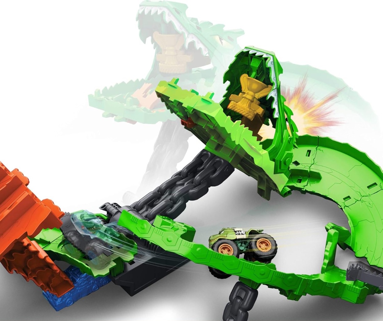 Încarcă ambele vehicule în lansatorul dublu și privește-le cum se avântă unul lângă altul direct prin gura monstrului. În interior, un diverter cu lanț decide aleatoriu soarta cursei: una dintre mașini poate fi eliminată, iar cealaltă continuă spre linia de sosire.