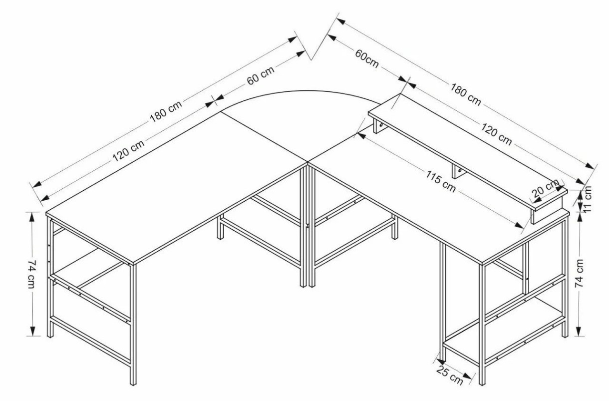 Cele două suprafețe de lucru, situate în partea dreaptă și stângă, măsoară 180 cm în lățime, 74 cm în înălțime și 60 cm în adâncime, oferind spațiu amplu pentru organizarea cărților, laptopului și materialelor de studiu. Raftul de 115 cm lățime, 11 cm înălțime și 20 cm în adâncime adaugă loc suplimentar pentru depozitare, menținând zona de lucru ordonată.