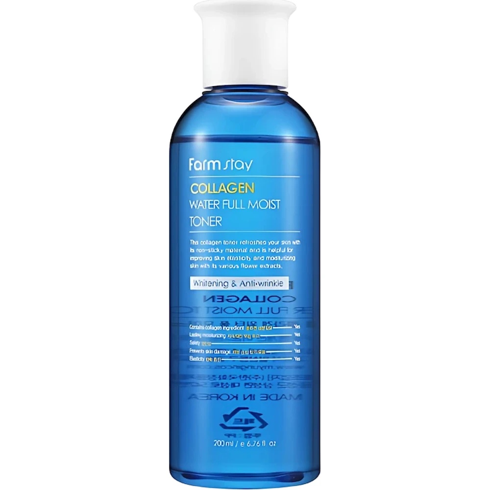 Tonerul pentru față FarmStay Collagen Water Full Moist Toner 200ml menține hidratarea optimă a pielii, îmbunătățește fermitatea și uniformizează tonul. Formula cu colagen marin hidrolizat hrănește și întărește pielea, iar acidul hialuronic asigură hidratare de lungă durată. (yesstyle.com)