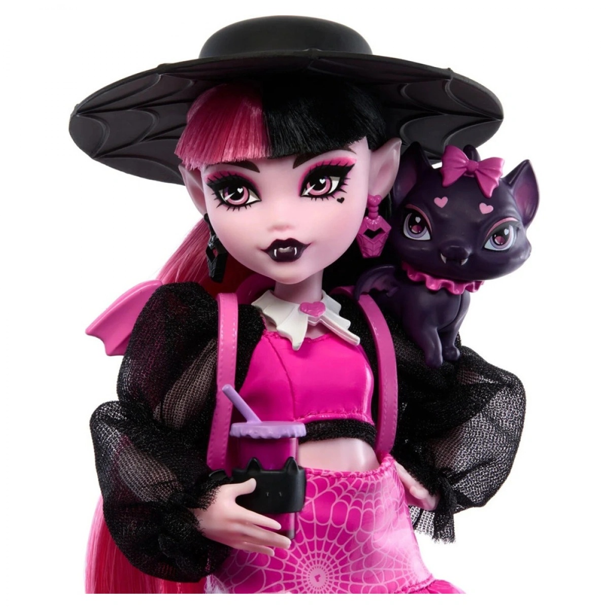 Această păpușă Monster High este o adevărată vrăjitoare vampir! Draculaura își etalează ținuta dințișoară (uimitoare) într-o ținută complet roz și neagră. Animalul ei de companie perfect, Contele Fabulos, este și el în apropiere, arătând la fel de înfricoșător ca întotdeauna! Cu un corp poziționabil și accesorii înfricoșătoare pentru joacă, păpușa Draculaura este un cadou fantastic pentru copiii cu vârsta de 4 ani și peste.