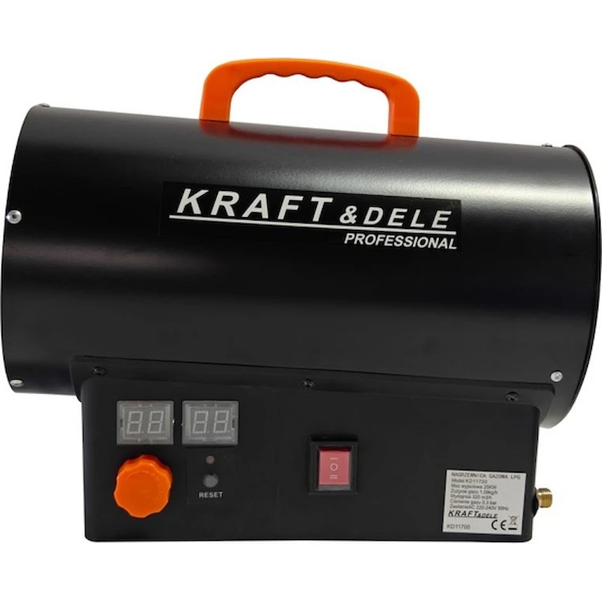 Acest încălzitor pe bază de propan-butanan (LPG) Kraft & Dele KD11700 cu o putere de 25 kW este echipat cu un termostat încorporat cu reglare a temperaturii și un ecran digital, care permite setarea ușoară a temperaturii dorite. Încălzitorul funcționează automat în funcție de temperatura setată.