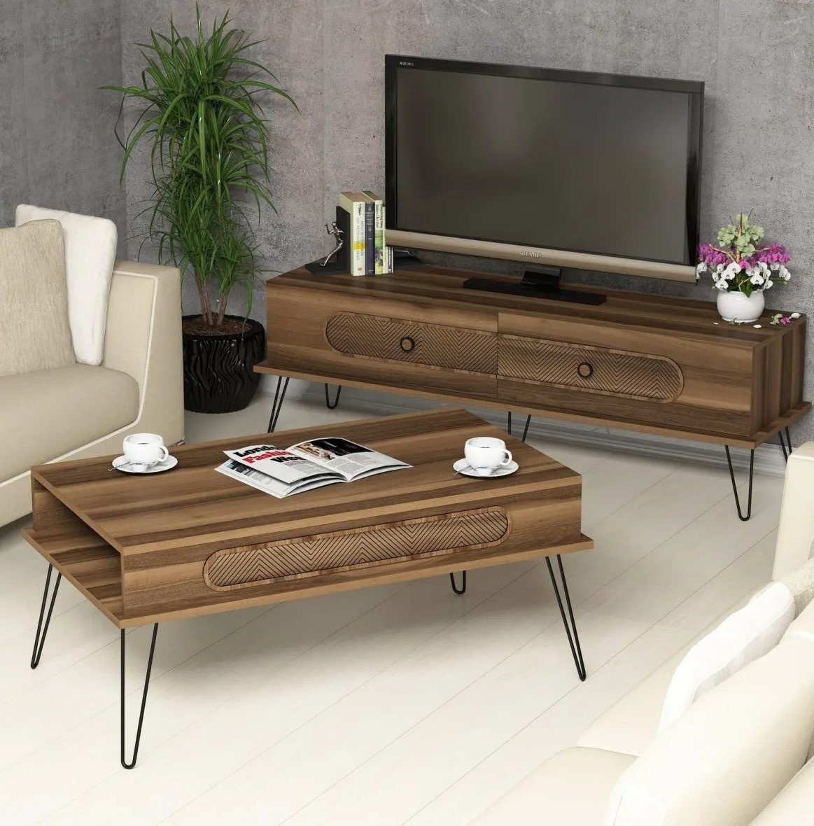 Unitatea tv dispune de numeroase rafturi, permițându-vă să organizați în mod ordonat dispozitive media, cărți și obiecte decorative. Măsuța de cafea oferă o suprafață generoasă pentru băuturi, gustări și reviste. Ambele piese pot fi fixate pe perete pentru un plus de stabilitate și siguranță.