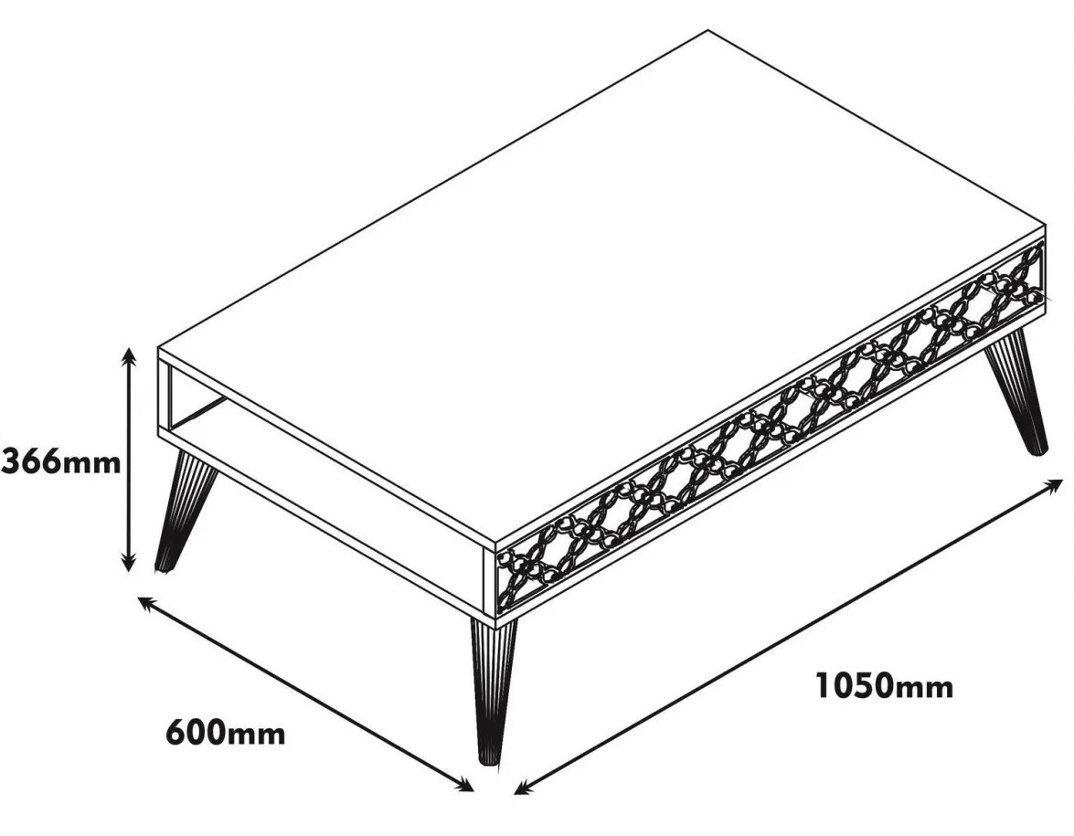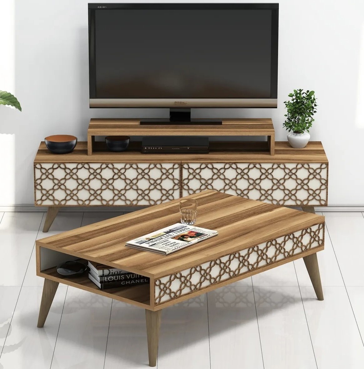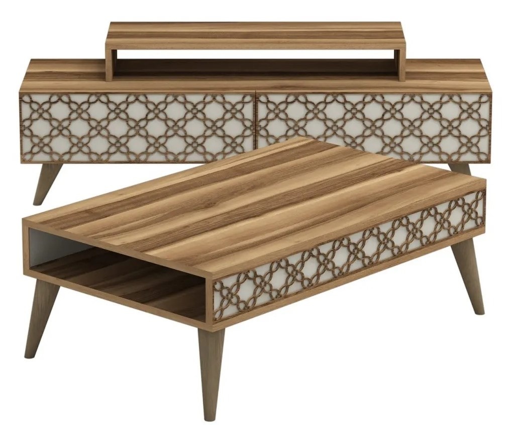 Setul include o unitate TV spațioasă și o măsuță de cafea elegantă, oferind spațiu generos pentru dispozitive media și alte obiecte. Rafturile multiple facilitează organizarea, iar picioarele din plastic asigură stabilitate și durabilitate.