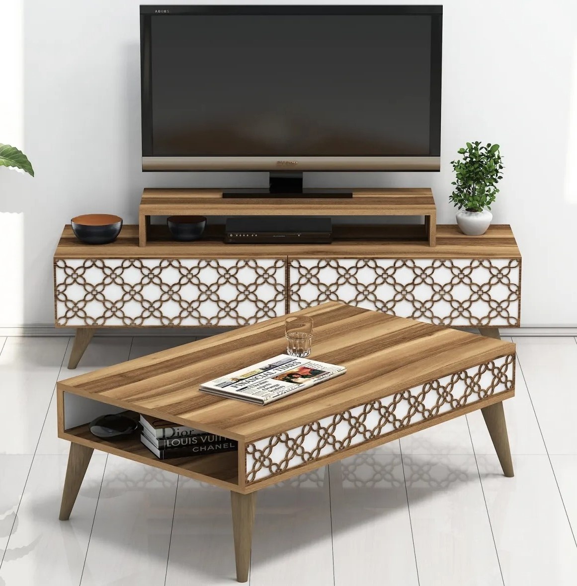 Setul include o unitate TV spațioasă și o măsuță de cafea elegantă, oferind spațiu generos pentru dispozitive media și alte obiecte. Rafturile multiple facilitează organizarea, iar picioarele din plastic asigură stabilitate și durabilitate.