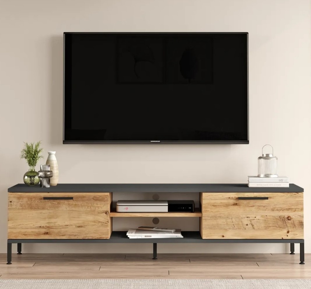 Cu un design modern și elegant, unitatea TV îmbunătățește instantaneu aspectul camerei de zi. Liniile curate oferă un aer rafinat și se potrivesc atât în decoruri contemporane, cât și în amenajări mai clasice, completând armonios estetica încăperii.