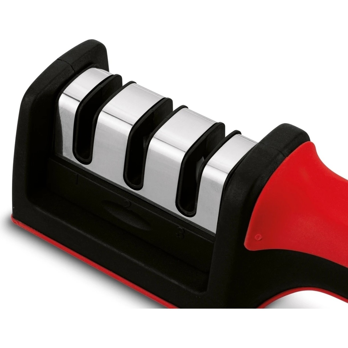 Acesta este un ascuțitor în trei etape, ceea ce înseamnă că puteți finaliza sarcina în trei pași simpli. Mai întâi, reparați cuțitul, apoi modelați muchia de tăiere și, în final, neteziți suprafața și îndepărtați bavurile. Este la fel de simplu pe cât pare! Ascuțitorul de bucătărie utilizează discuri diferite la fiecare nivel. În prima fază, acestea sunt discuri de tungsten, deoarece acesta este momentul modelării și îndepărtării defectelor. Apoi vin discurile de diamant - ideale pentru modelarea precisă a unui cuțit care va rămâne ascuțit pentru o lungă perioadă de timp. În cele din urmă, treceți-l de câteva ori peste suprafața ceramică.