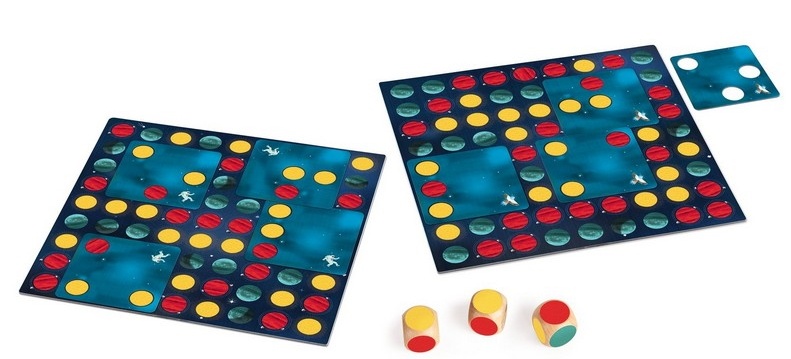 In set4 plăci galaxii reversibile, 4 seturi de 6 cărți de constelație, 3 zaruri