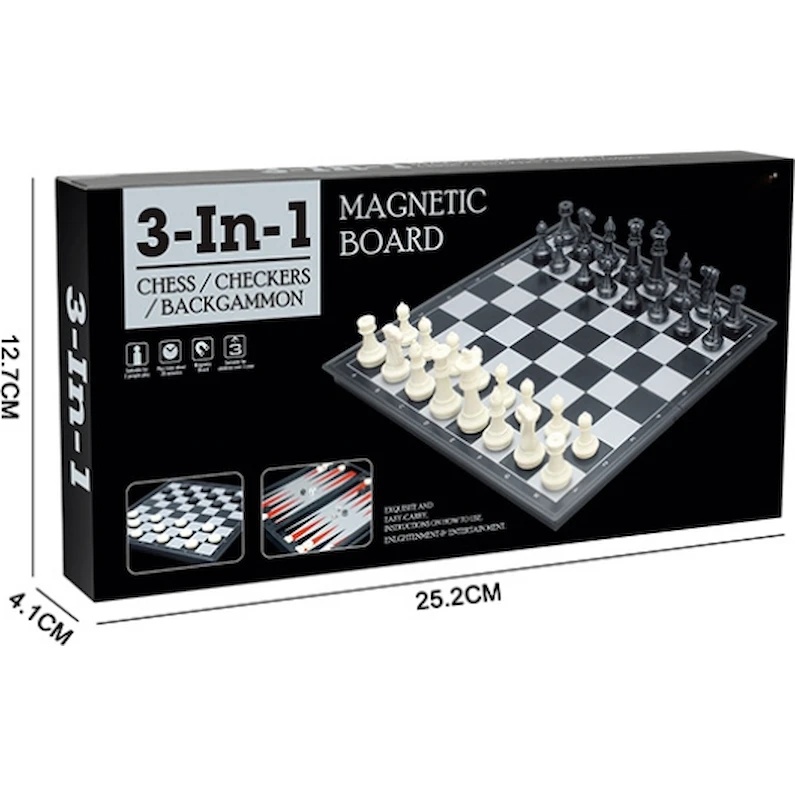 Principalul avantaj al acestui minunat set este versatilitatea sa, deoarece include trei jocuri populare în același timp. Copilul va putea juca șah, table sau dame preferate. O cutie compactă, convenabilă pentru depozitare și călătorie, cu închizătoare, performanță excelentă folosind coloranți de înaltă calitate și materiale inofensive – totul din acest set vă va mulțumi în mod plăcut.