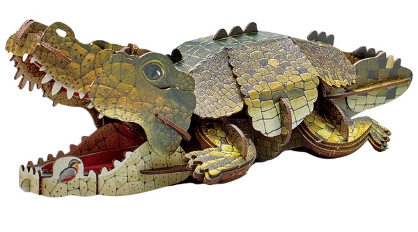 Setul conține 54 de piese din carton reciclat, care se asamblează pas cu pas într-un crocodil fascinant, surprinzând fiecare detaliu al pielii solzoase și maxilarele puternice care se pot deschide și închide pentru realism sporit.