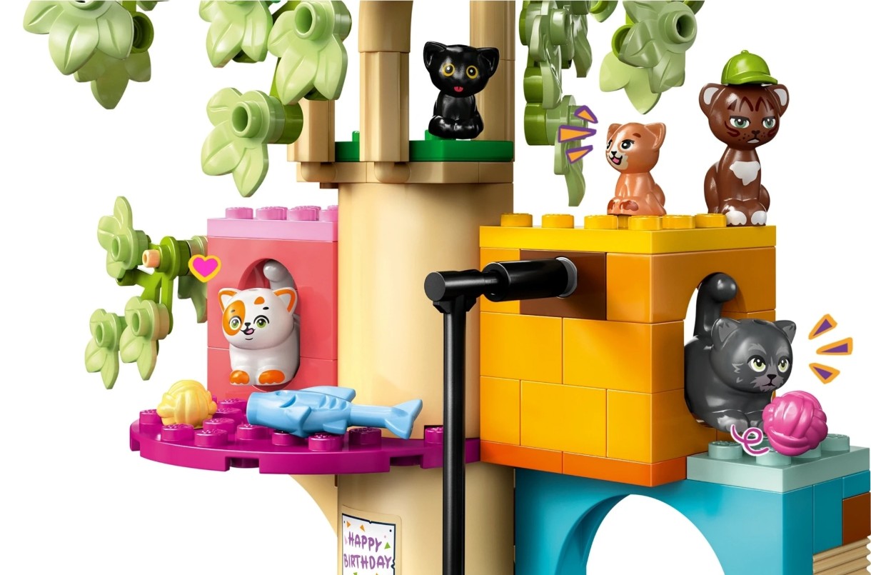 Descoperă un set de joacă în formă de lăbuță pentru fete, băieți și iubitori de pisici cu vârsta de 6 ani și peste. Căsuța în copac LEGO® Friends Petrecere de ziua de naștere a pisicilor (42666) include 2 figurine mini-păpuși, 5 figurine pisici și o mulțime de accesorii pentru o joacă creativă plină de momente dulci cu pisici.