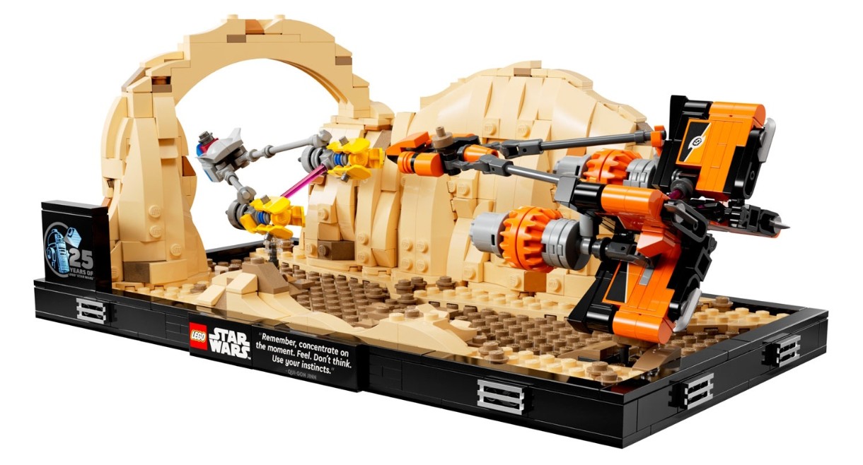 Impresionantul model de construcție și expunere vine cu o placă cu sfaturi de la Qui-Gon Jinn („Ține minte. Fii în clipă. Simte. Nu gândi. Ai încredere în instinctele tale.”) și o cărămidă LEGO Star Wars aniversară de 25 de ani LEGO Star Wars.