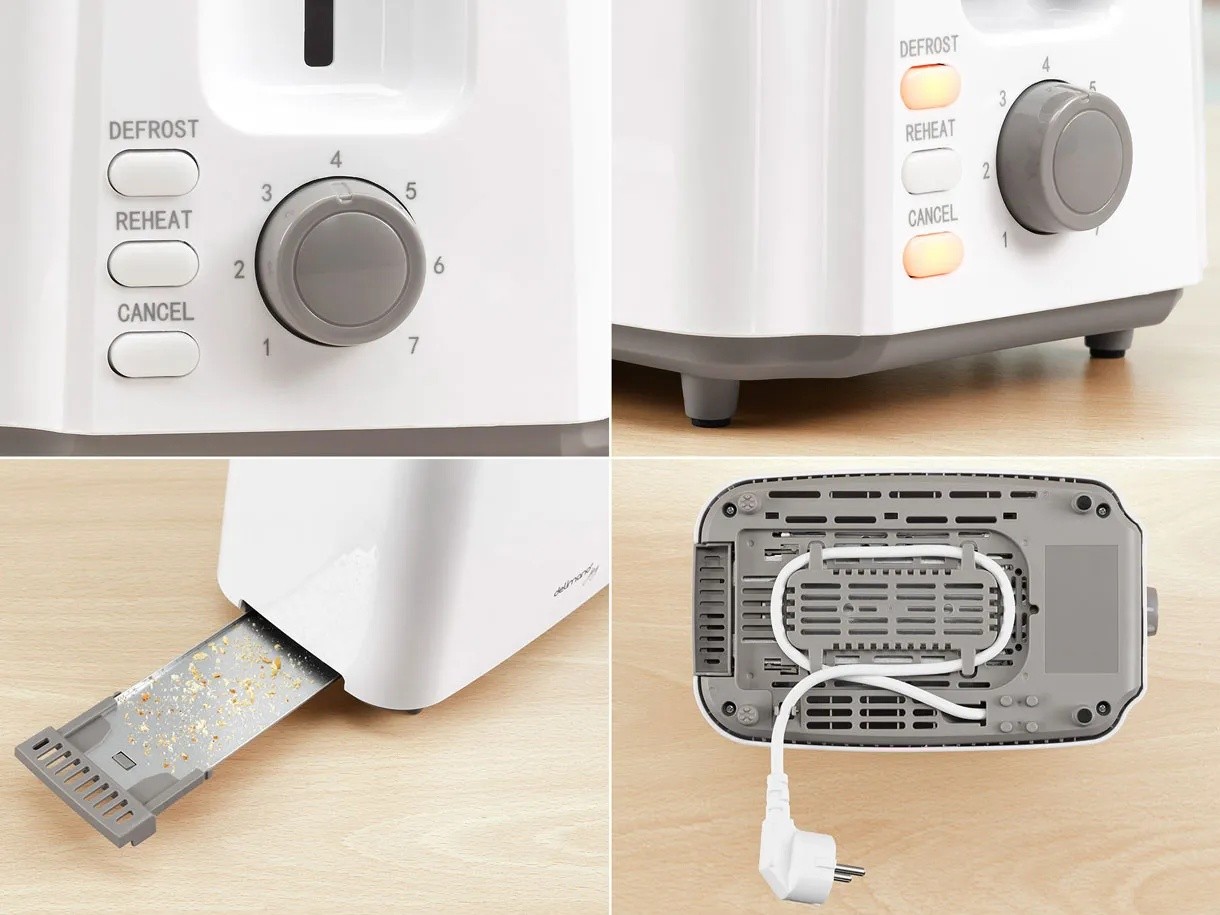 - Tavă detașabilă pentru firimituri – curățare rapidă și simplă;