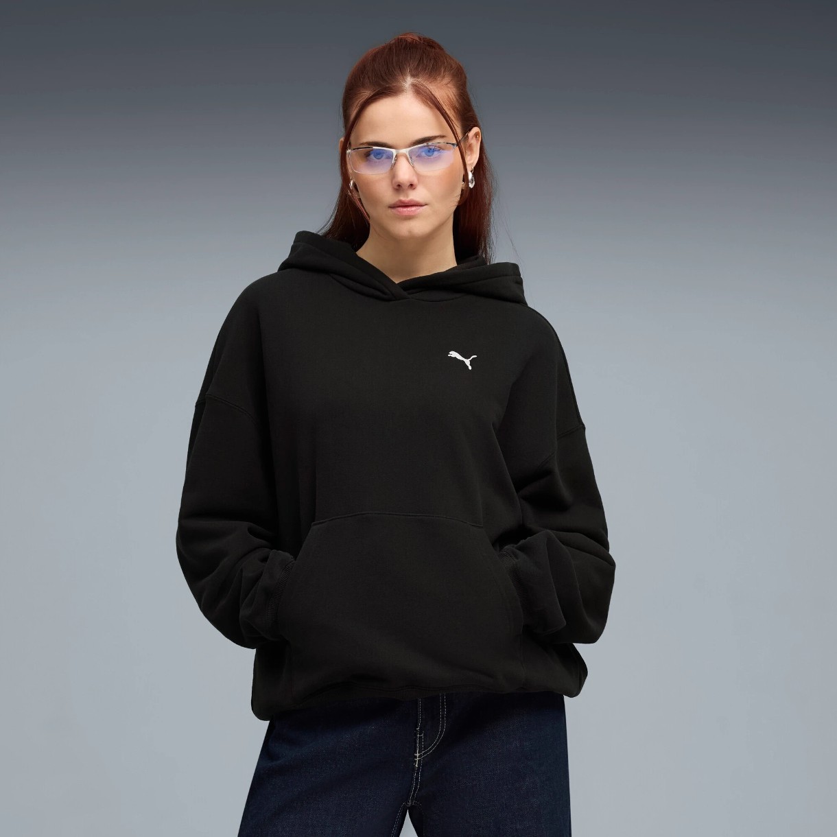 Designul modelului este minimalist și versatil: mânecile lungi și logo-ul PUMA Cat brodat pe piept subliniază caracterul sportiv al produsului. Hanoracul este realizat din minimum 20% materiale reciclate, ceea ce îl face ecologic fără a compromite stilul și confortul.