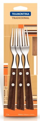 Set din 3 furculițe de masă Tramontina Tradicional cu mîner comod din lemn. Piesele din set sunt fabricate din oțel inoxidabil de înaltă calitate AISI 420. Calitatea oțelului asigură faptul că produsele Tramontina nu sunt susceptibile coroziunii și (la păstrarea condițiilor de expluatare ) își vor păstra luciul pentru o perioadă lungă de timp.