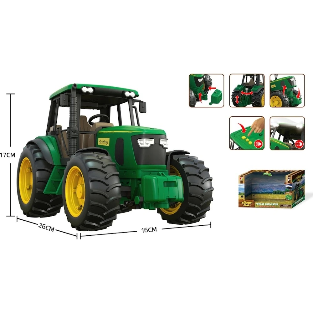 Зеленый трактор с звуками и светом - это захватывающая игрушка, идеально подходящая для маленьких фермеров! Этот трактор оснащен звуковыми эффектами и огнями, что добавляет игре больше реализма. Система трения позволяет легко двигать трактор, не используя батареи.