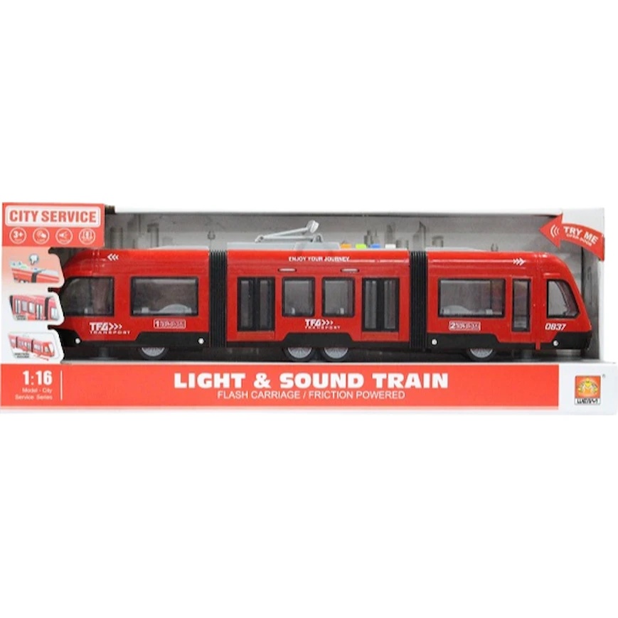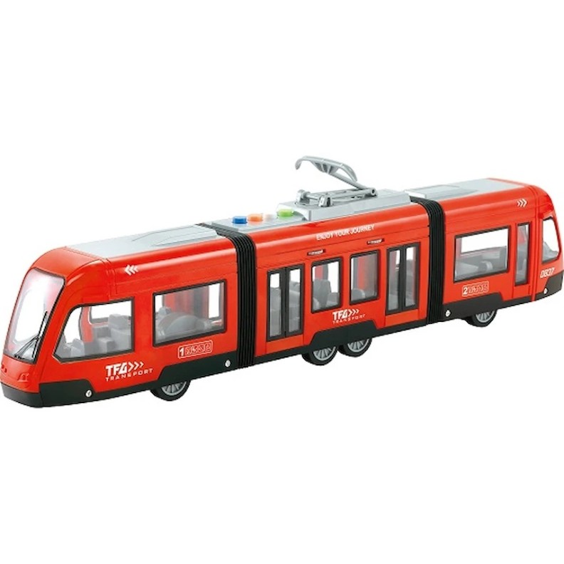 Tramvaiul viu colorat este echipat cu mecanism cu inerție, efecte luminoase și sonore. Tramvaiul are un aspect realist și uși care se deschid. În timpul jocului captivant, copiii vor avea nevoie de imaginație, gândire logică și abilitatea de a crea un fir narativ complex. Jocul cu tramvaiul contribuie la dezvoltarea motricității fine și îmbunătățește coordonarea mișcărilor.