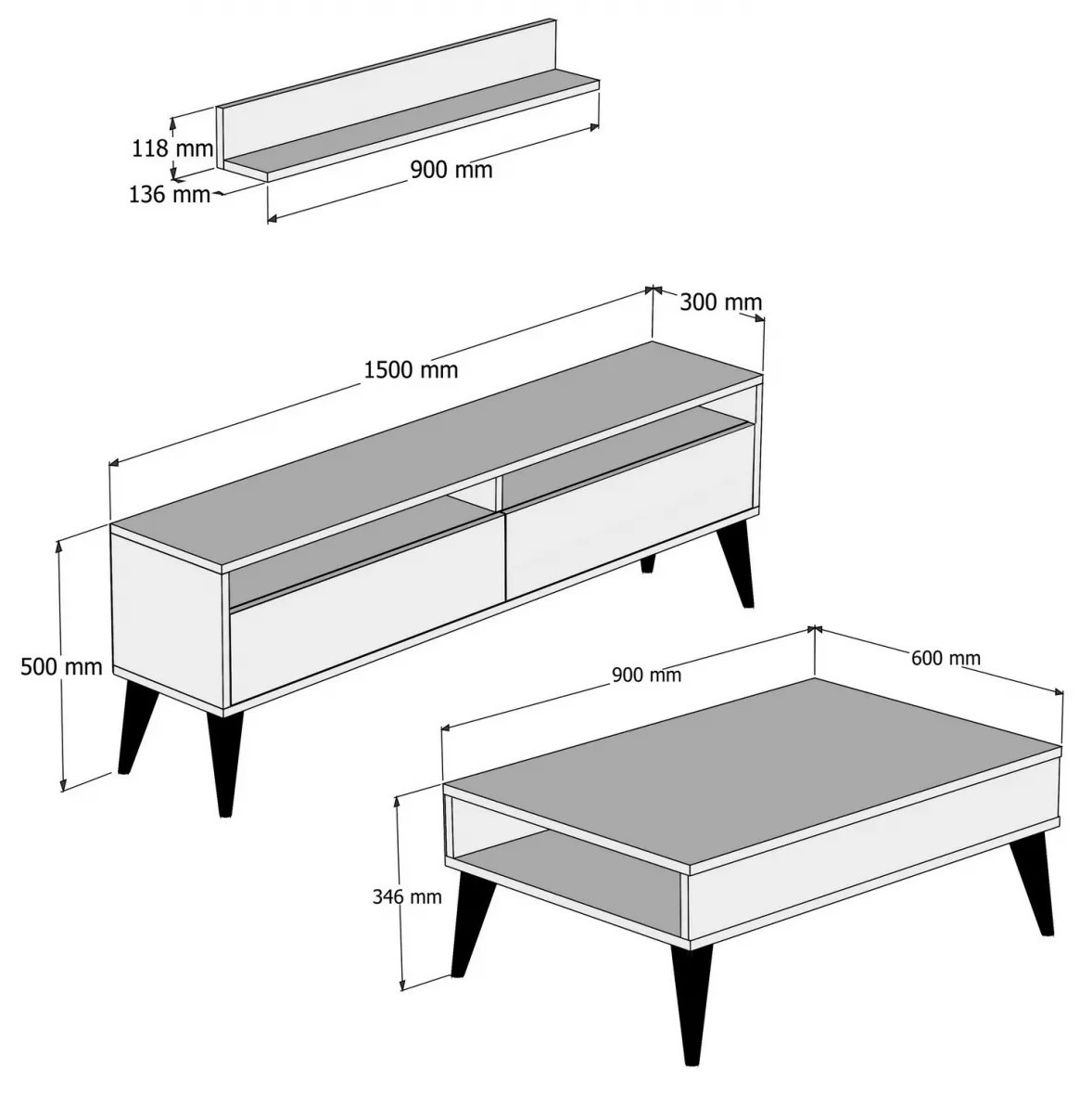 Setul include unitate TV, raft de perete și măsuță de cafea, oferind suficient spațiu pentru depozitare și expunere. Rafturile permit organizarea cărților, obiectelor decorative și a fotografiilor. Posibilitatea de a fixa mobilierul pe perete ajută la optimizarea spațiului și menținerea ordinii.