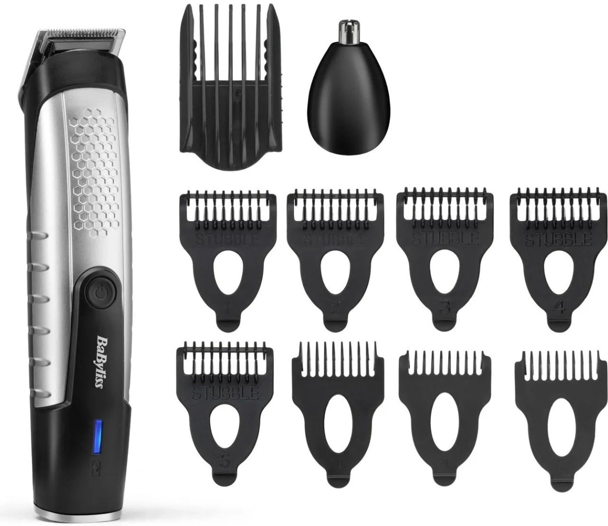 Set1 pieptene pentru barbă reglabil cu 5 poziții (2, 4, 6, 8, 10 mm) 5 accesorii cu peri (0,5, 0,7, 0,9, 1,1, 1,3 mm), 3 duze pentru contururi (3, 5, 7 mm), Cablu de încărcare USB