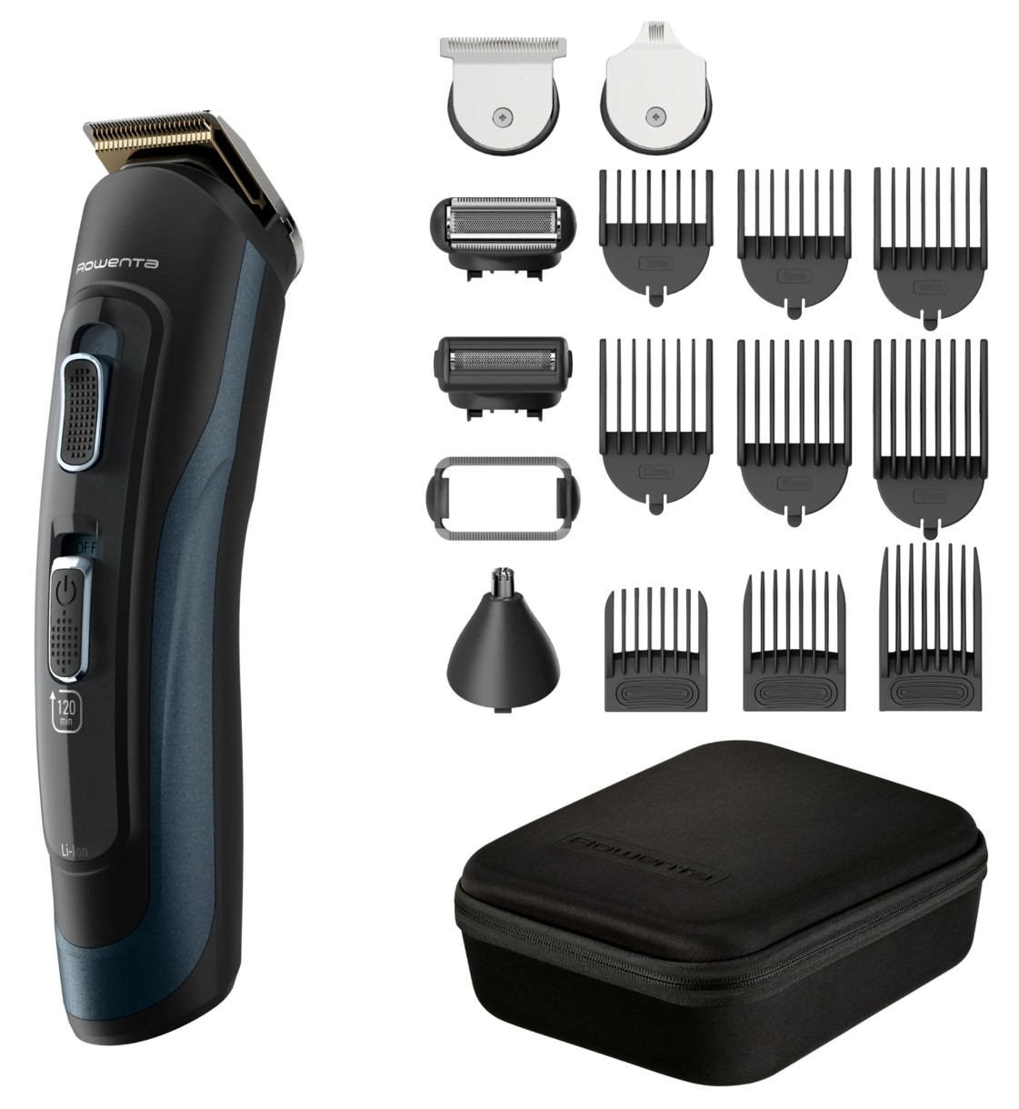 Set6 accesorii telescopice pentru tuns cap (3-6-9-12-15-18 mm), 3 accesorii telescopice pentru tuns barba, Lamă de tuns de 44 mm, Lamă pentru barbă de 32 mm, Accesoriu pentru rasul feței de 32 mm, Accesoriu pentru rasul corpului de 37 mm cu limitator, Accesoriu pentru urechi și nas de 7 mm, Aparat de tuns de 7 mm, Geantă de transport de 7 mm, Ulei pentru lame de 7 mm, Perie de curățare de 7 mm