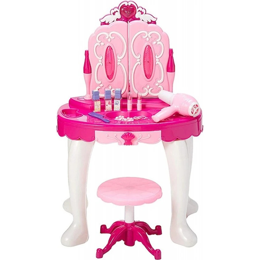 Și, de asemenea, setul include diverse accesorii pentru fetiță: un pieptene de păr, agrafe, mărgele etc., un uscător de păr alimentat de baterii și produse cosmetice pentru bebeluși. Măsuța îi va încânta pe cei mici cu efecte de lumină și sunet, iar când apăsați un buton, sertarele se deschid și cântă muzica.