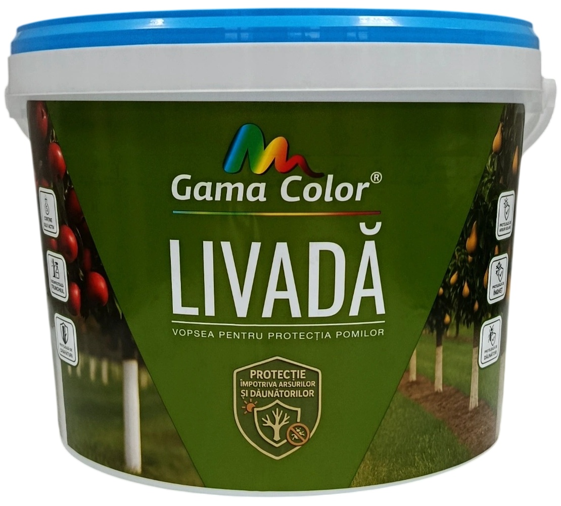 Vopseaua de grădină Gama Color cu protecție împotriva dăunătorilor este concepută pentru aplicarea preventivă și terapeutică a vopselei pe trunchiuri și bazele ramurilor scheletice pentru a îmbunătăți rezistența la iarnă a pomilor fructiferi și ornamentali. Vopseaua protejează scoarța copacilor de arsurile solare, dezinfectează trunchiurile și ramurile și distruge agenții patogeni și dăunătorii. Vopseaua poate fi folosită și pentru a acoperi tăieturile după tăierea în grădină.