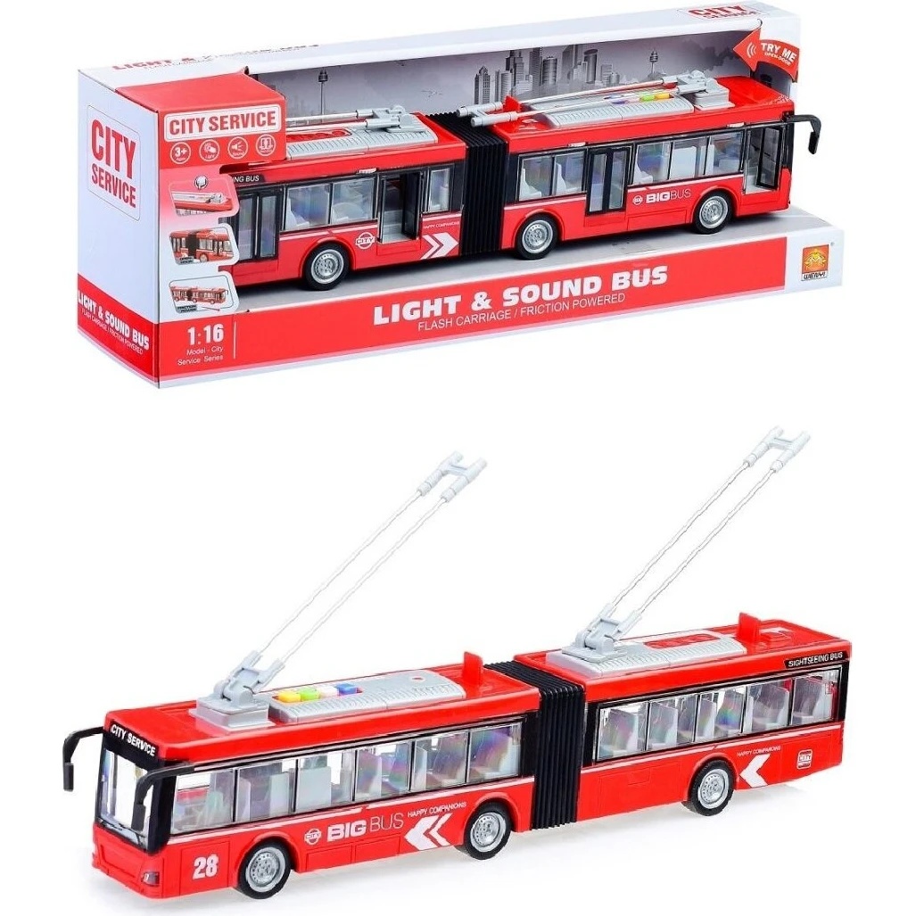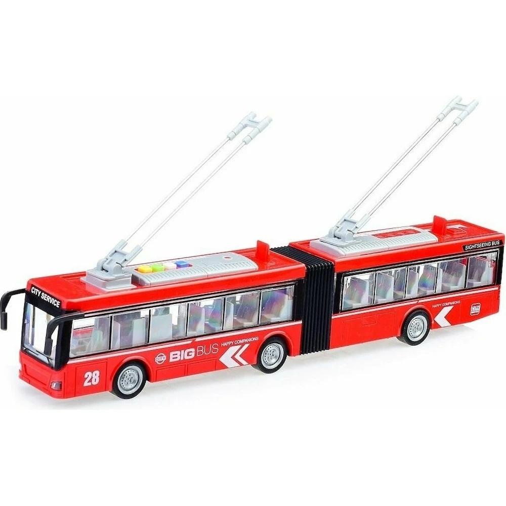 Troleibuzul cu inerție este o jucărie realistă și atractivă, concepută pentru copiii pasionați de transportul public. Realizat la scară 1:16, modelul impresionează prin designul modern, forma articulată și detaliile atent realizate, precum ferestrele mari, interiorul vizibil și elementele specifice unui troleibuz urban.