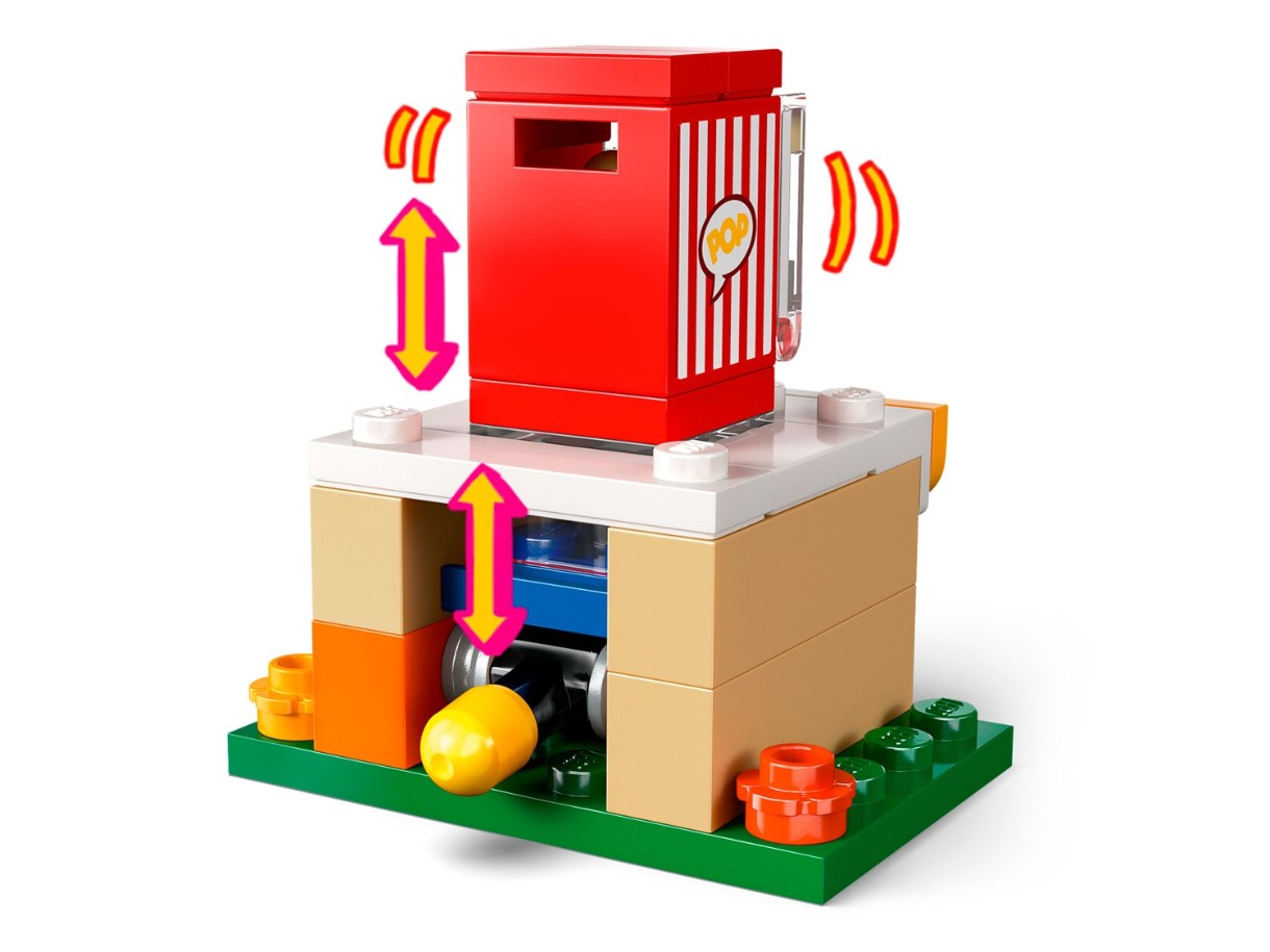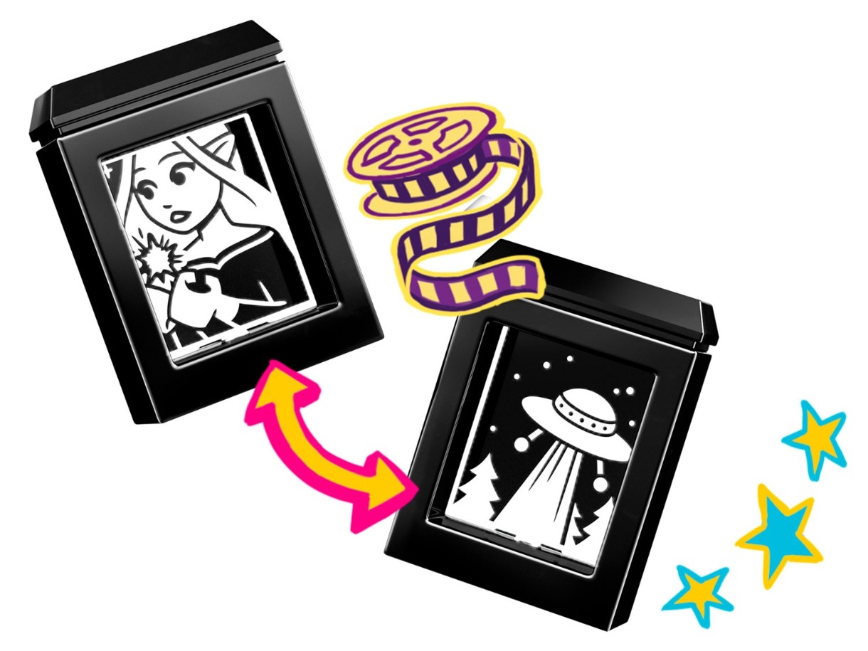 Este „Lumini, cameră, prietenie!”, în timp ce copiii spun povestea prietenilor Paisley și Alia, care se bucură de un film în grădina lui Paisley. Introduceți diapozitivul în proiector și apăsați cărămida luminoasă pentru a vedea imaginea apărând pe ecranul mare. Descoperiți o varietate de accesorii, inclusiv un aparat de popcorn cu o pârghie pentru a face popcornul să „pop”! Alte accesorii includ o cutie de popcorn, băuturi, o carte de benzi desenate și 2 scaune confortabile.