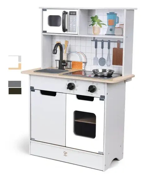 Transformă joaca într-o aventură culinară cu setul de joacă „Bucătăria modernă” cu lumină și sunet de la Hape! Această bucătărie modernă din lemn este dotată cu plită care se aprinde, sunete realiste de gătit și robinet funcțional. Setul include o tigaie, o spatulă și alte accesorii pentru a începe distracția imediat.