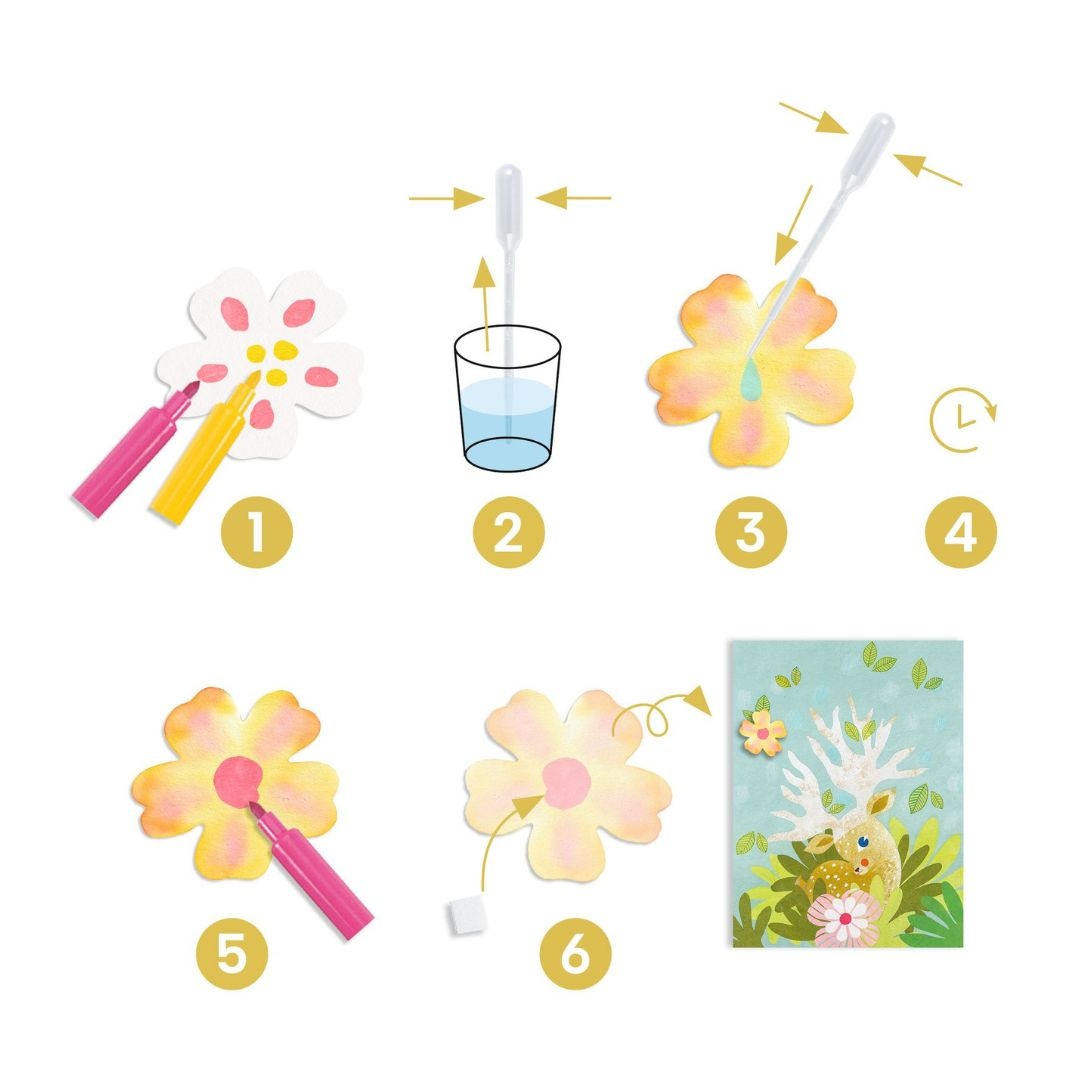 Joc creativ de decorat cu hartie O experienta creativa complet noua. Pe hartia absorbanta faceti cateva puncte cu carioca si adaugati o picatura de apa folosind pipeta: Cerneala va incepe sa se raspandeasca... Rezultatele sunt incredibile! Odata ce desenul este uscat, utilizati banda dublu adeziva inclusa pentru a-l lipi pe fundalul ilustrat. Rezultatul final poate decora camera. Instructiuni simple pas cu pas pentru rezultate diferite de tot ce stiati. Brosura cu instructiuni color, folosind doar imagini. Continut: 4 fundaluri ilustrate (21 x 28 cm), 8 coli pre-taiate de hartie absorbanta, 4 carioci, 2 foi absorbante, pipeta, autocolante cu doua fete, brosura de instructiuni. Varsta recomandata: 3-6 ani. Fabricat din hartie si carton. Ambalaj din carton certificat FSC® AVERTISMENT: Contraindicat copiilor sub 18 luni. A se folosi sub directa supraveghere a unei persoane adulte. Producator: Djeco