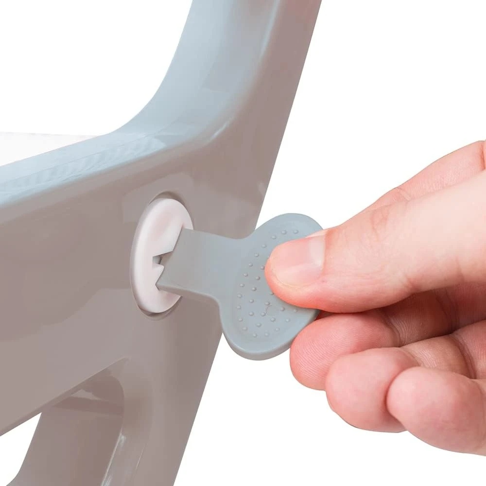 Modelul are formă anatomică și spătar ergonomic pentru susținerea spatelui, iar lateralele oferă stabilitate și siguranță. Reductorul este fabricat din plastic rezistent și sigur, ușor de curățat și care nu absoarbe umezeala.