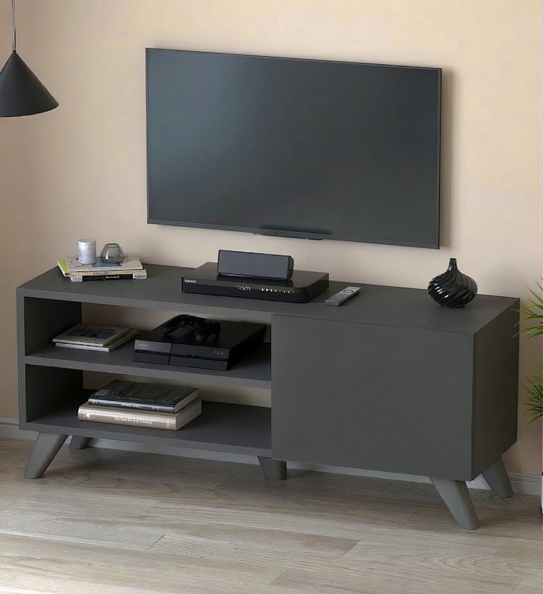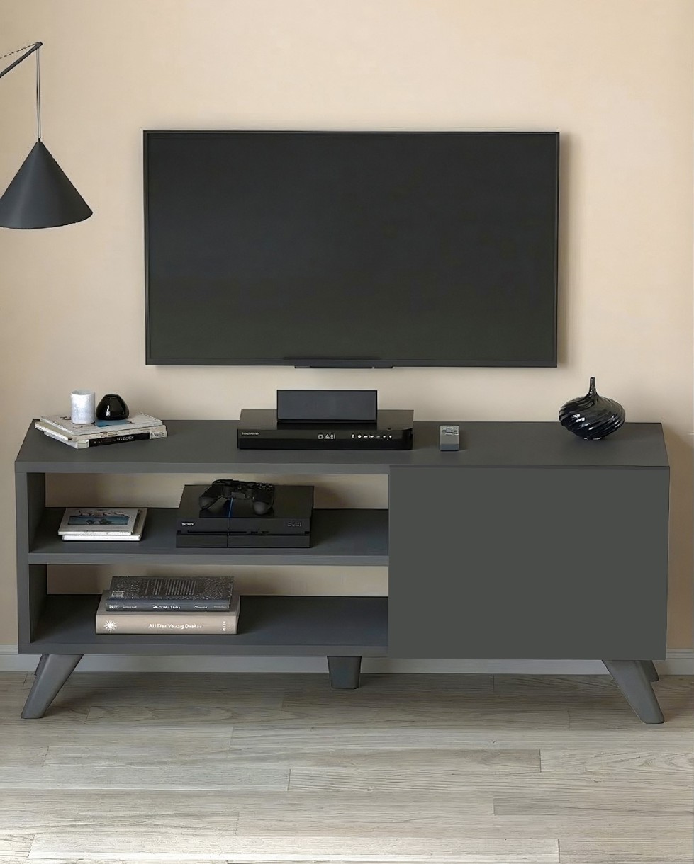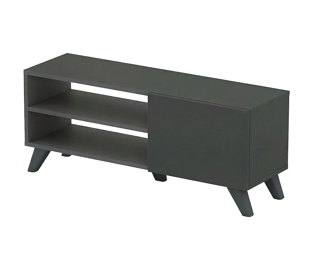 Rafturile deschise permit amplasarea echipamentelor multimedia, iar compartimentul cu ușă ajută la ascunderea obiectelor și menținerea unui aspect curat și organizat.