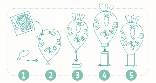 In set5 baloane (inclusiv 1 suplimentar), 4 seturi de autocolante, 4 cochilii de carton, 4 baze, 10 bucăți de carton, 1 set de instrucțiuni