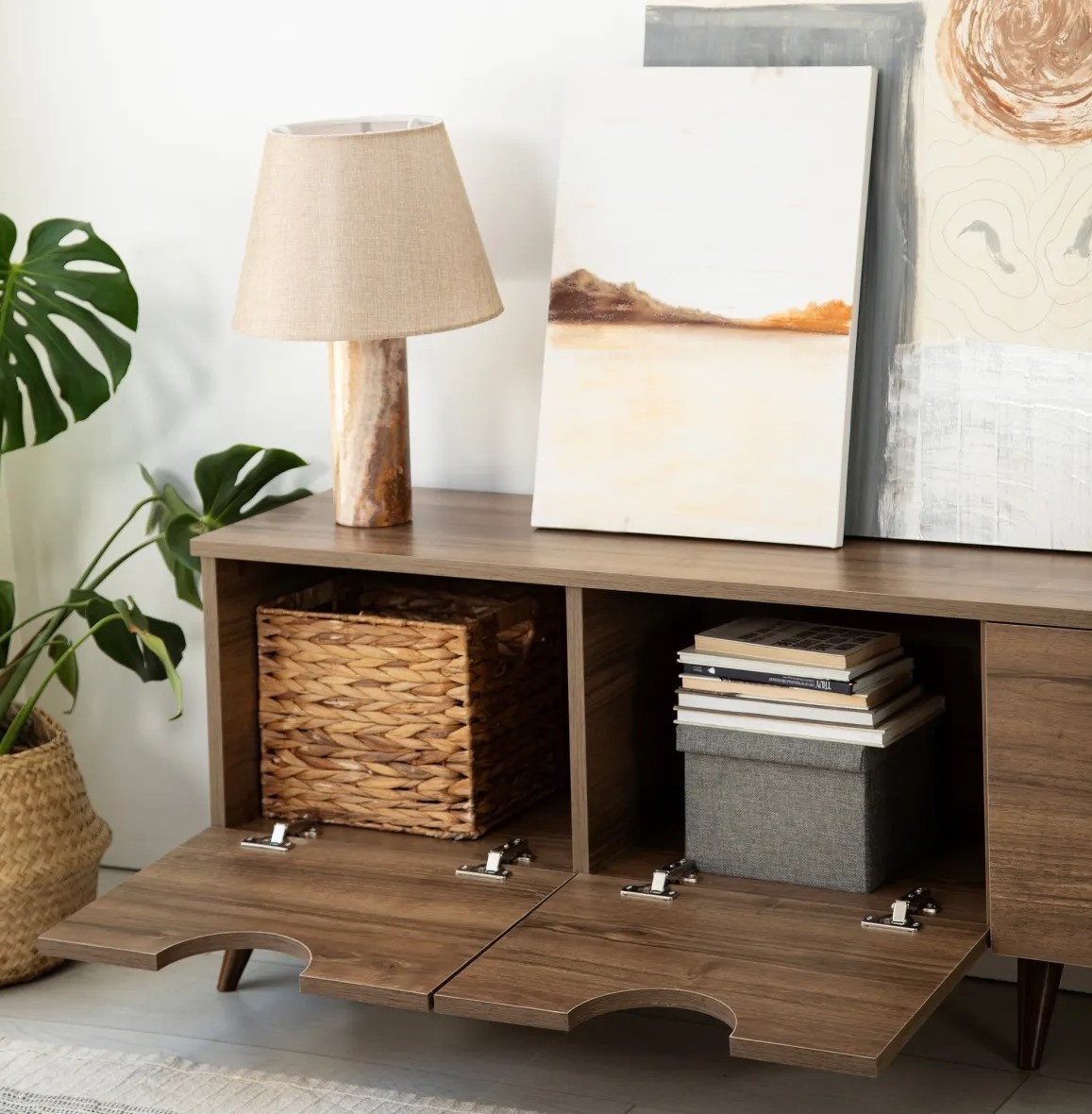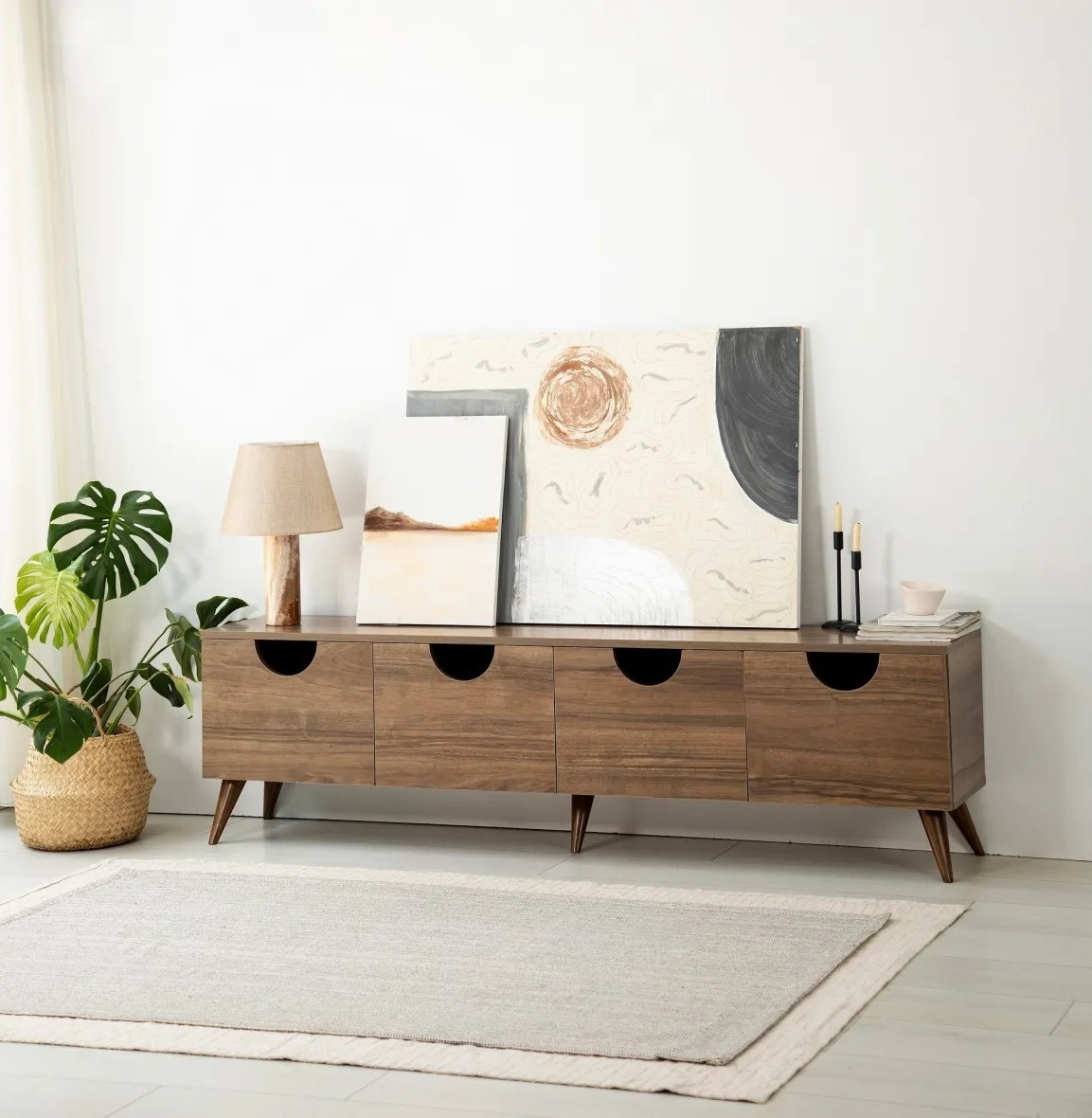 Suprafața suportului TV are o textură plăcută și discretă, integrându-se cu ușurință în diverse stiluri de interior și contribuind la o atmosferă primitoare.